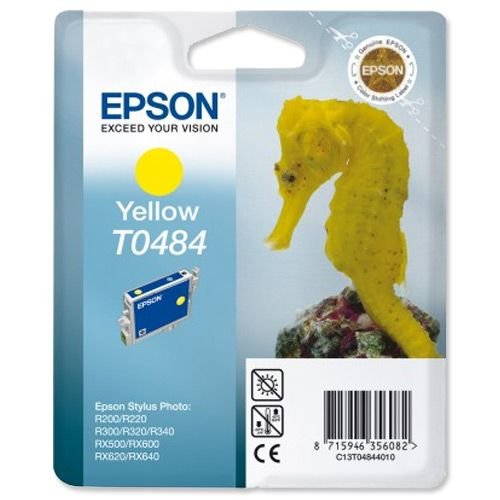 This Epson T0484 Yellow Inkjet Cartridge is for use in Epson Stylus Photo R200, R220, R300, R320, R330, R340, R350, RX300, RX320, RX500, RX600, RX620 and RX640 series printers. Each cartridge contains 13ml of ink with an approximate print yield of up to 450 pages. This pack contains 1 yellow inkjet cartridge.